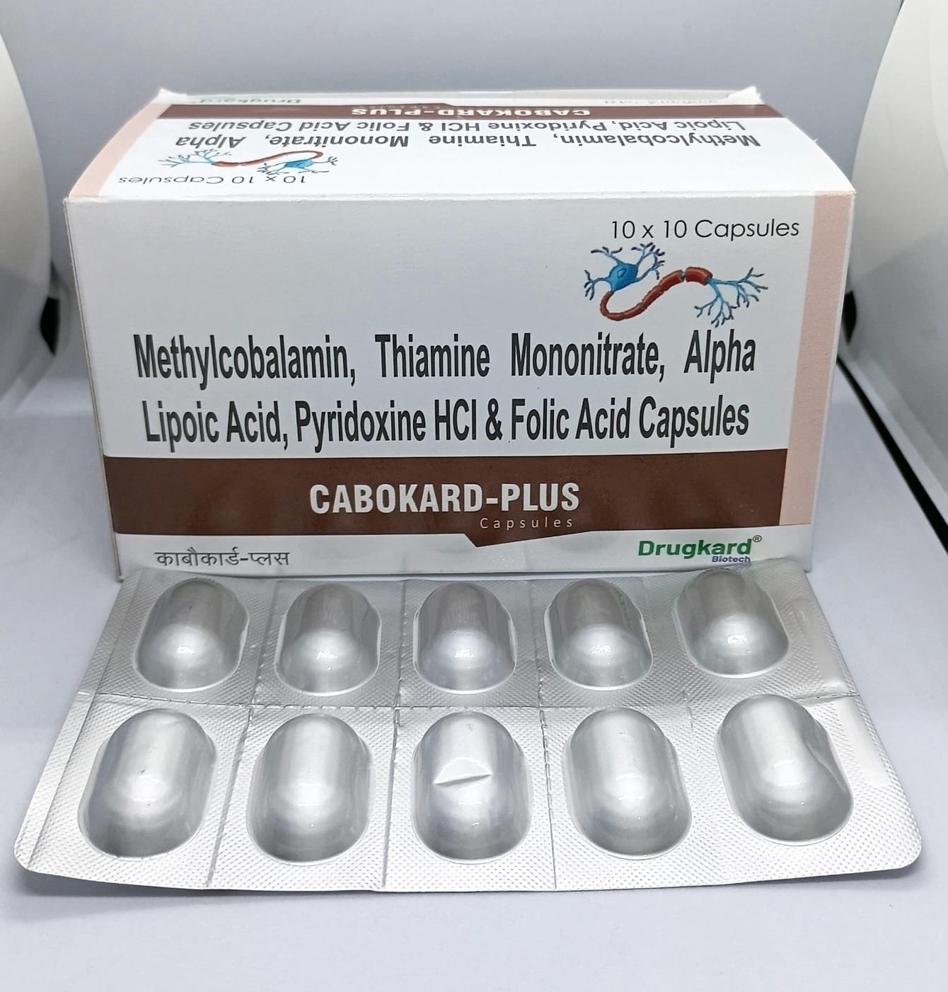 CABOKARD-PLUS is an advanced neurotropic formulation containing Methyl cobalamin, Alpha Lipoic Acid, Folic Acid, and Pyridoxine, designed for comprehensive nerve health support.