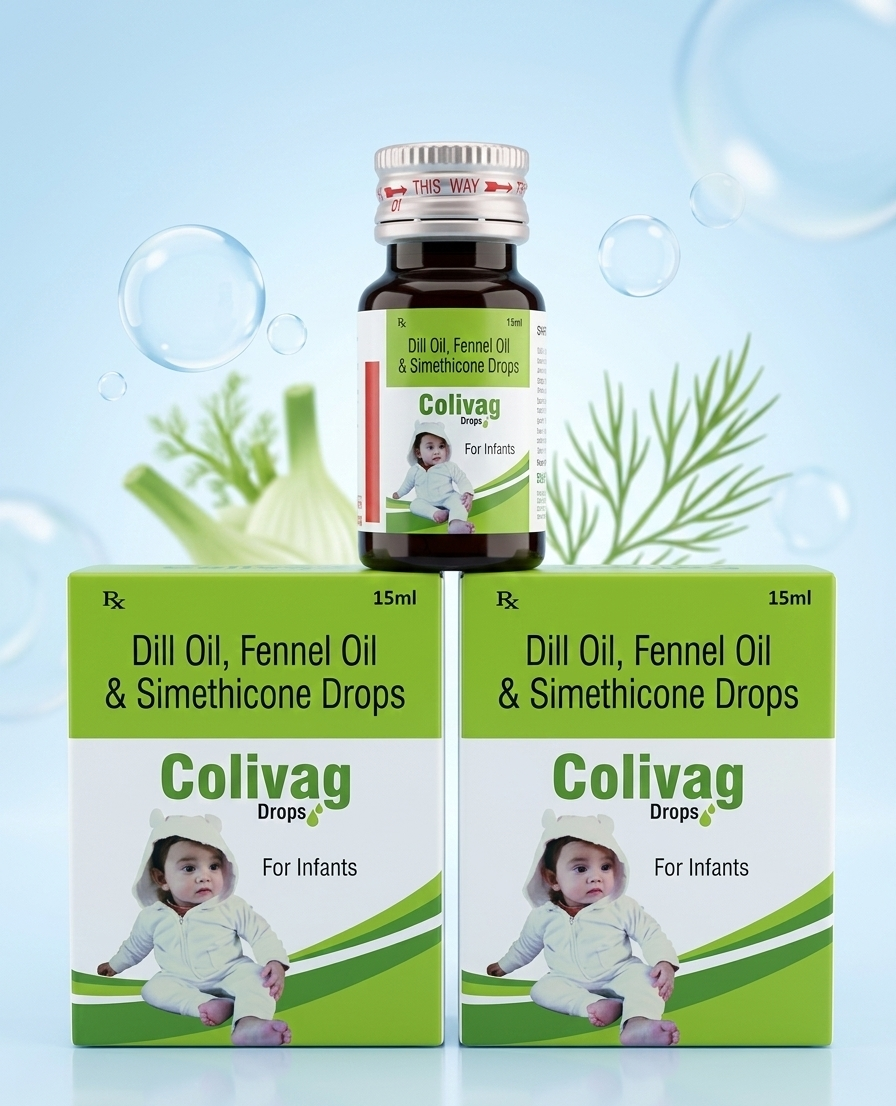 COLIVAG DROPS is a paediatric formulation containing Simethicone with herbal oils, designed for relief from infant colic and gas. It helps in reducing abdominal discomfort and bloating.