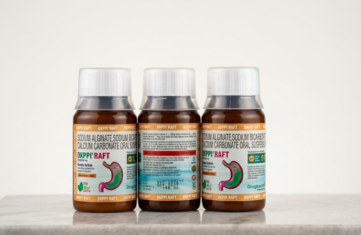 DKPPI RAFT contains Sodium Alginate, Sodium Bicarbonate, and Calcium Carbonate, designed to form a protective raft over stomach contents. It provides relief from acid reflux and heartburn.