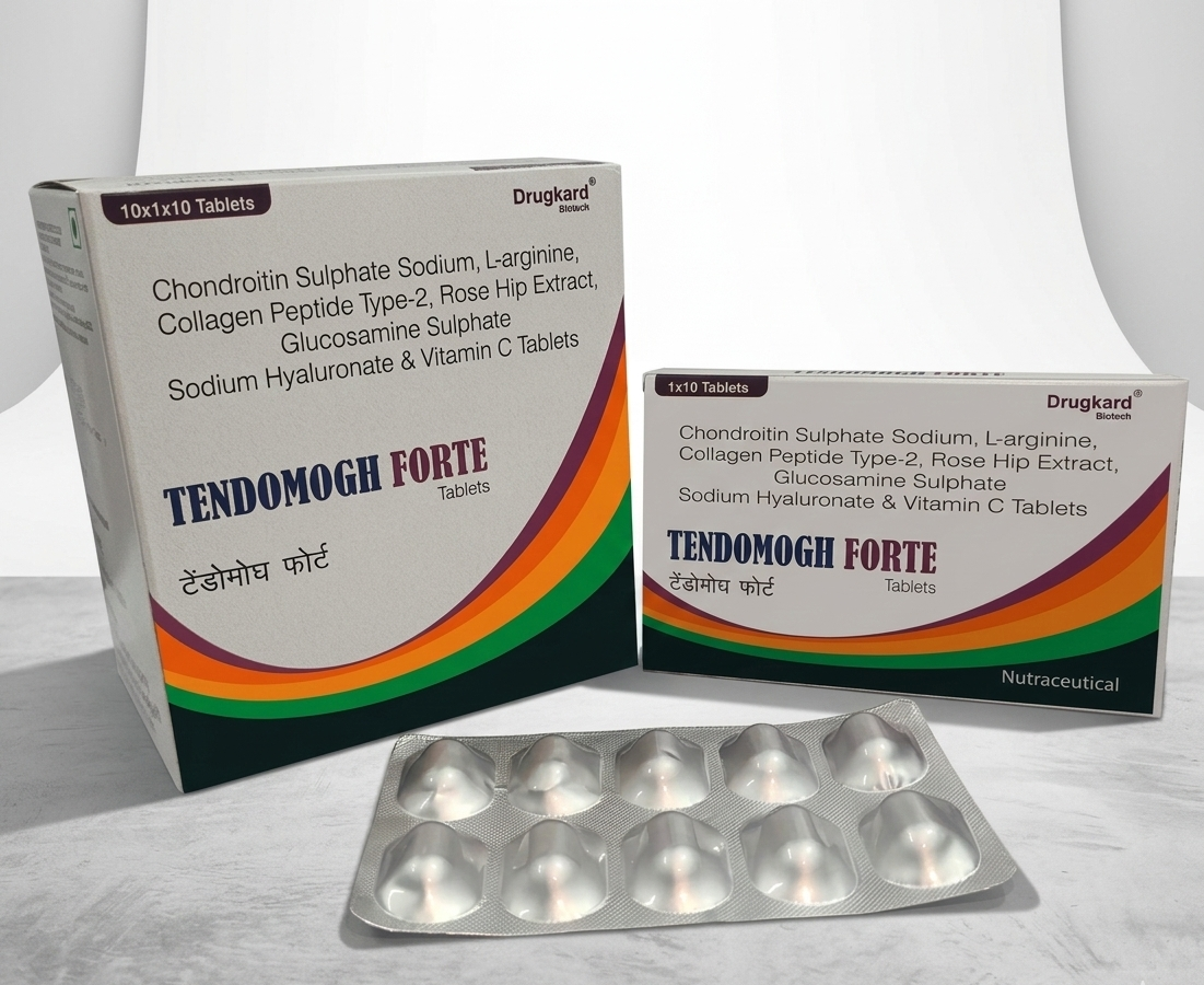 TENDOMOGH FORTE is an advanced formulation enriched with Chondroitin Sulphate Sodium Collagen peptide type II ,Rose hip Extract, Glucosamine sulphate, L-Arginine, Hyaluronic Acid, Vitamin C and essential nutrients, designed for comprehensive joint care and cartilage support.