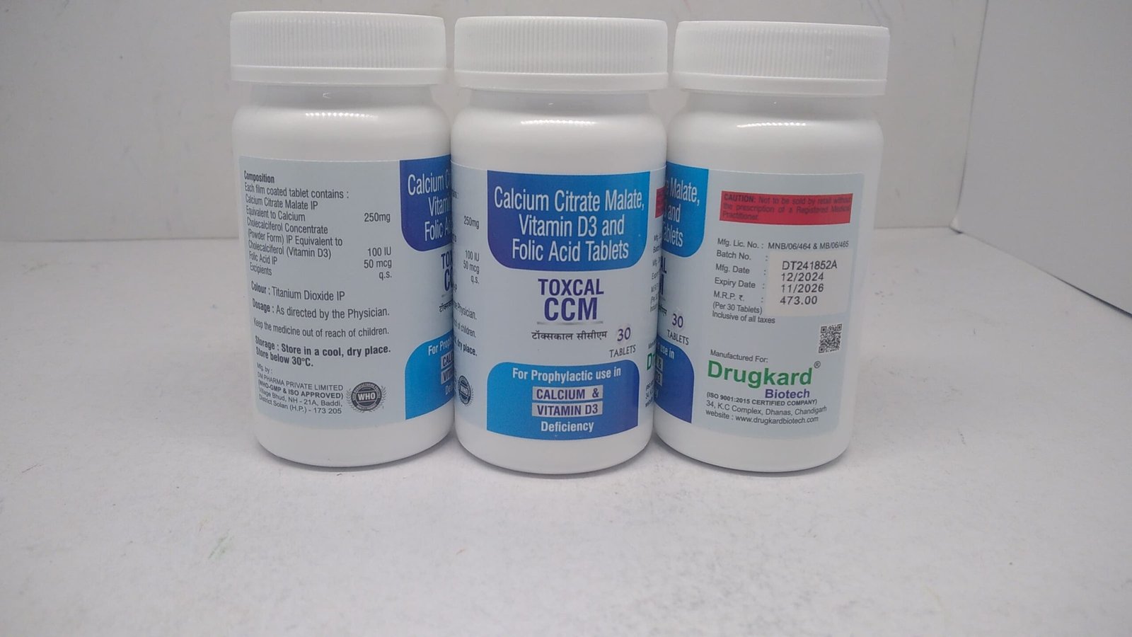 TOXCAL-CCM is a balanced formulation of Calcium Citrate, Vitamin D3, and Folic Acid, designed to support bone strength and calcium metabolism. It helps in maintaining optimal bone density and preventing calcium deficiency-related disorders.